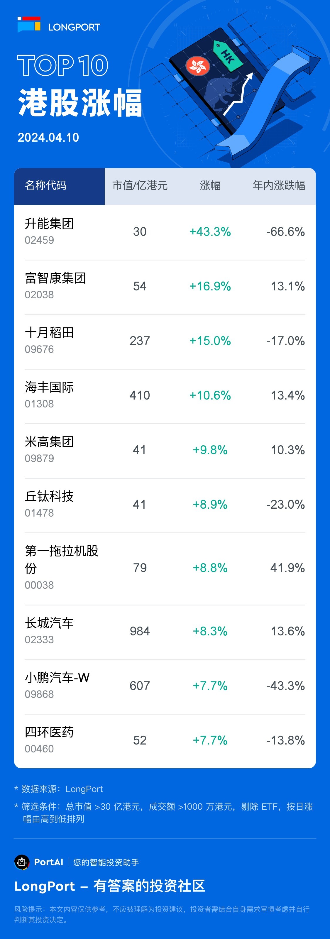 升能集团 (02459) 涨 43.33%,成交额 2885.2 万港元,年内累计跌 66.6%。