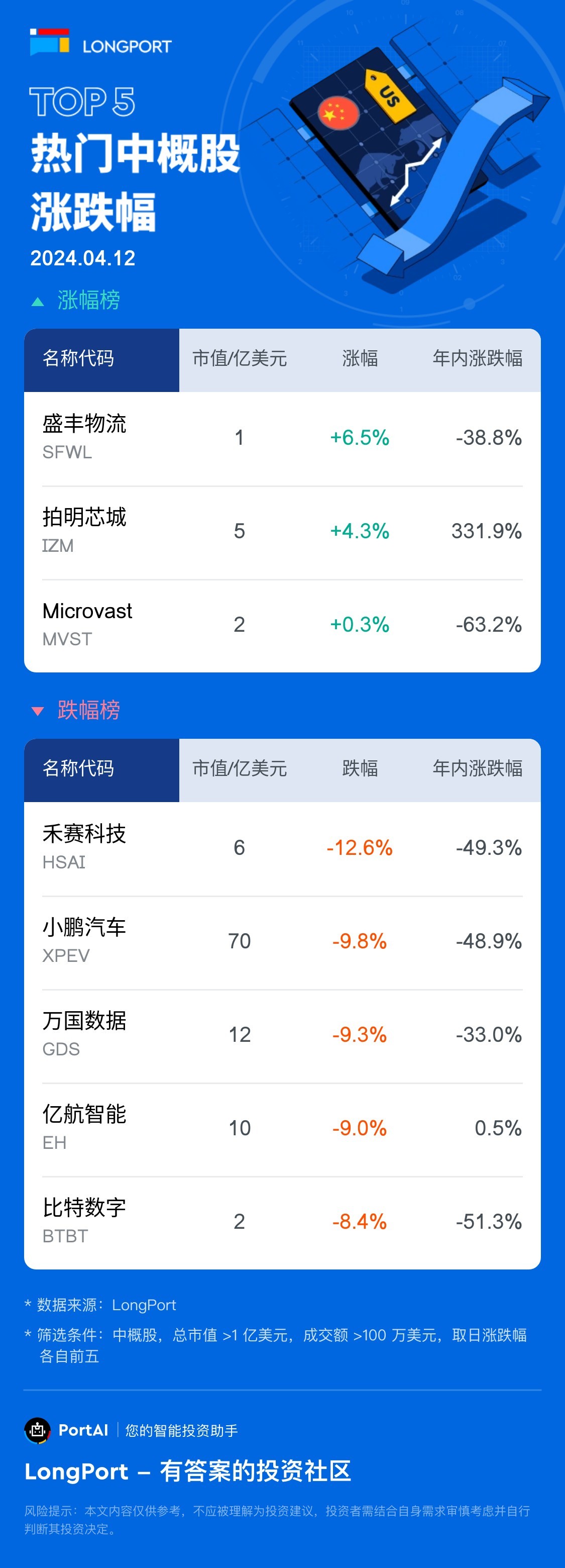 盛丰物流 (SFWL) 涨 6.51%,成交额 119.5 万美元,年内累计跌 38.8%。 拍明芯城 (IZM) 涨 4.33%,成交额 1.1 亿美元,年内累计涨 331.9%。 禾赛科技 (HSAI) 跌 12.57%,成交额 410.5 万美元,年内累计跌 49.3%。 小鹏汽车 (XPEV) 跌 9.79%,成交额 1.3 亿美元,年内累计跌 48.9%。