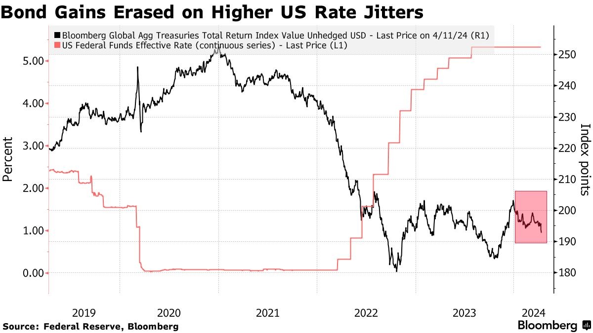 由于 2023 年年末以及今年年初押注美联储政策转向宽松的预期持续升温,今年年初利率期货市场一度押注美联储今年将降息 150 个基点。在买盘力量和降息预期的强力支撑之下,全球债券投资者们则在去年年末 “债券狂欢” 浪潮之中经历了连续 24 个月下跌后的勉强正向债券价格回报。