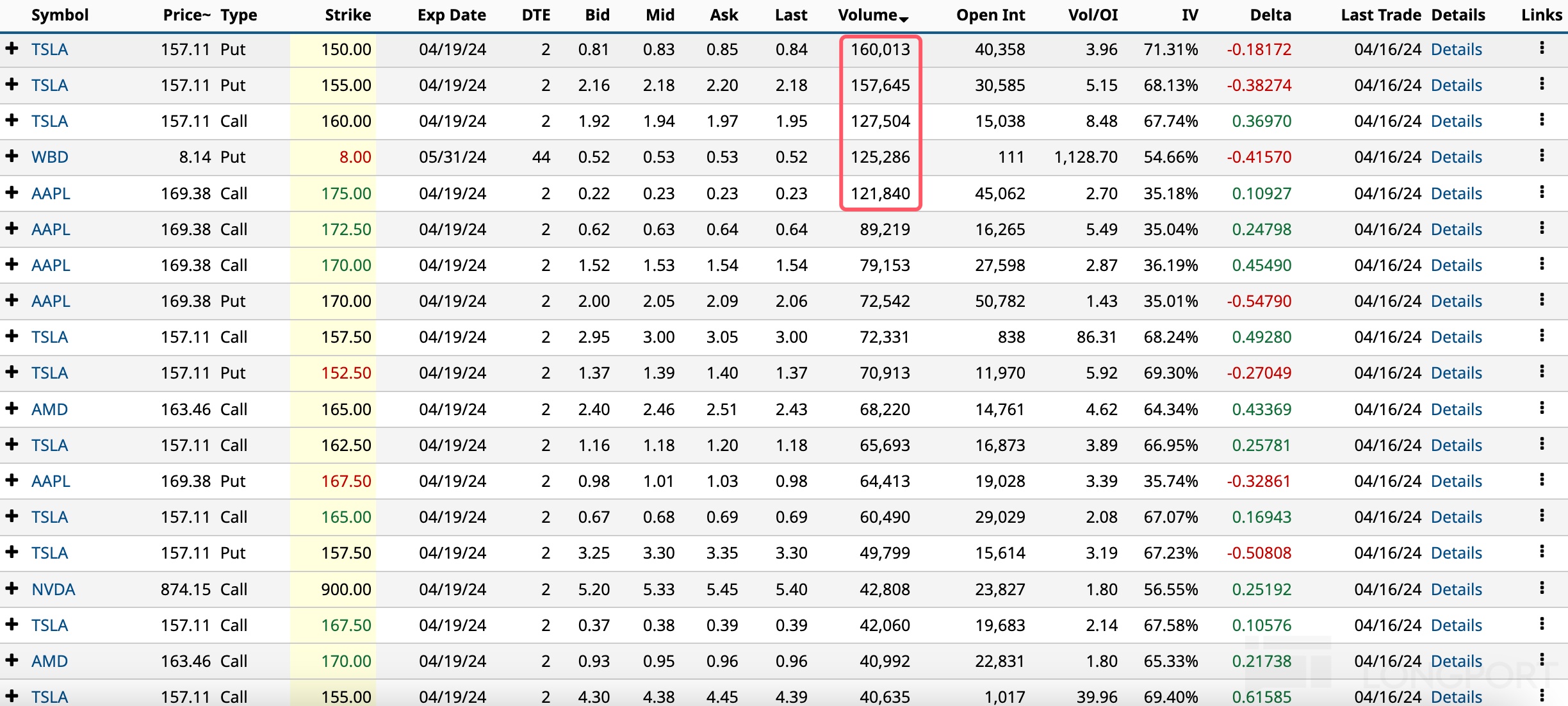 隔夜最火:4 月 19 日到期、执行价 150 美元和 155 美元的特斯拉 put 均成交 16 万张左右。WBD 期权成交暴涨至 30 万张,5 月 31 日到期、执行价 8 美元的看跌期权成交 12.5 万张。特朗普概念股 DJT 期权成交暴涨至 22 万张,看跌期权占比 65.4%。