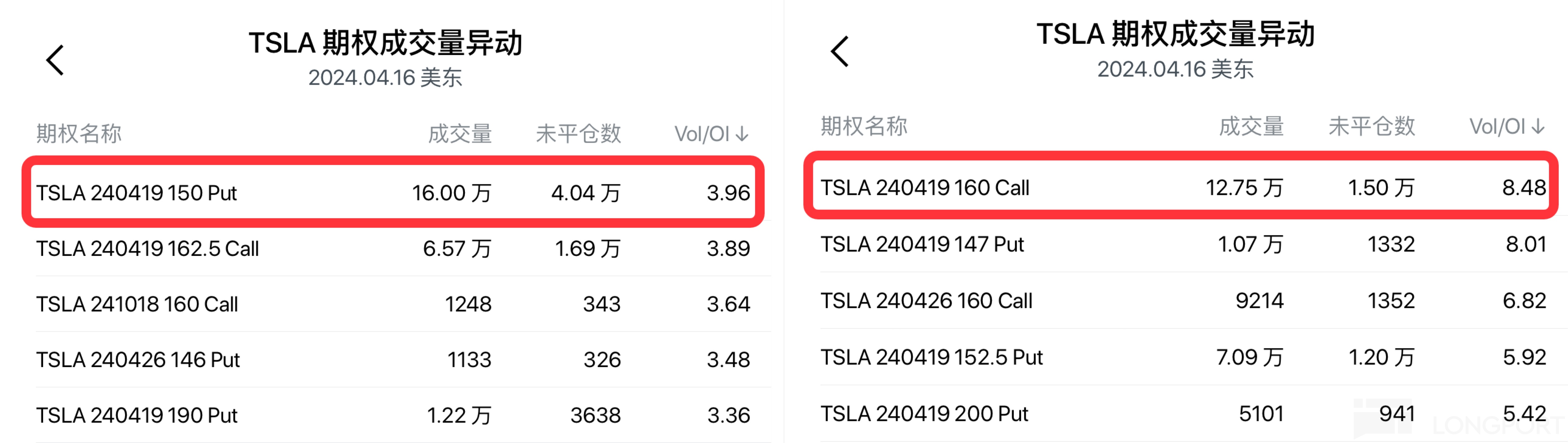 特斯拉跌近 3%,期权成交涨至 223 万张,看跌期权占比 54%。4 月 19 日到期、执行价 150 美元和 155 美元的看跌期权均成交 16 万张左右,执行价 160 美元的看涨期权成交 13 万张。