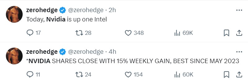 周五,英伟达延续周四的上涨,连涨两日,并且涨势加速,当日收涨超 6%,令本周的累计涨幅达到 15%,创下去年 5 月以来的 11 个月最大单周上涨,当时其公布财报显示 AI 芯片需求远超预期,单周涨幅达到超过 24%。