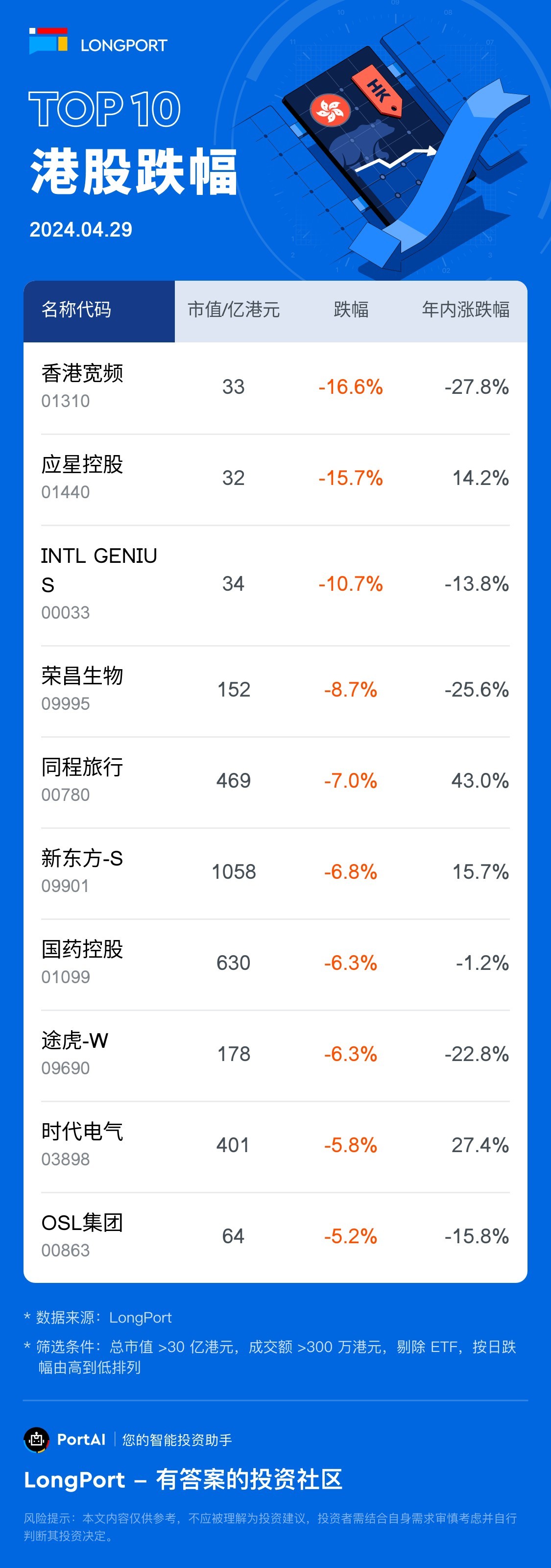 Top 10 HK Stock Losers (4.29)