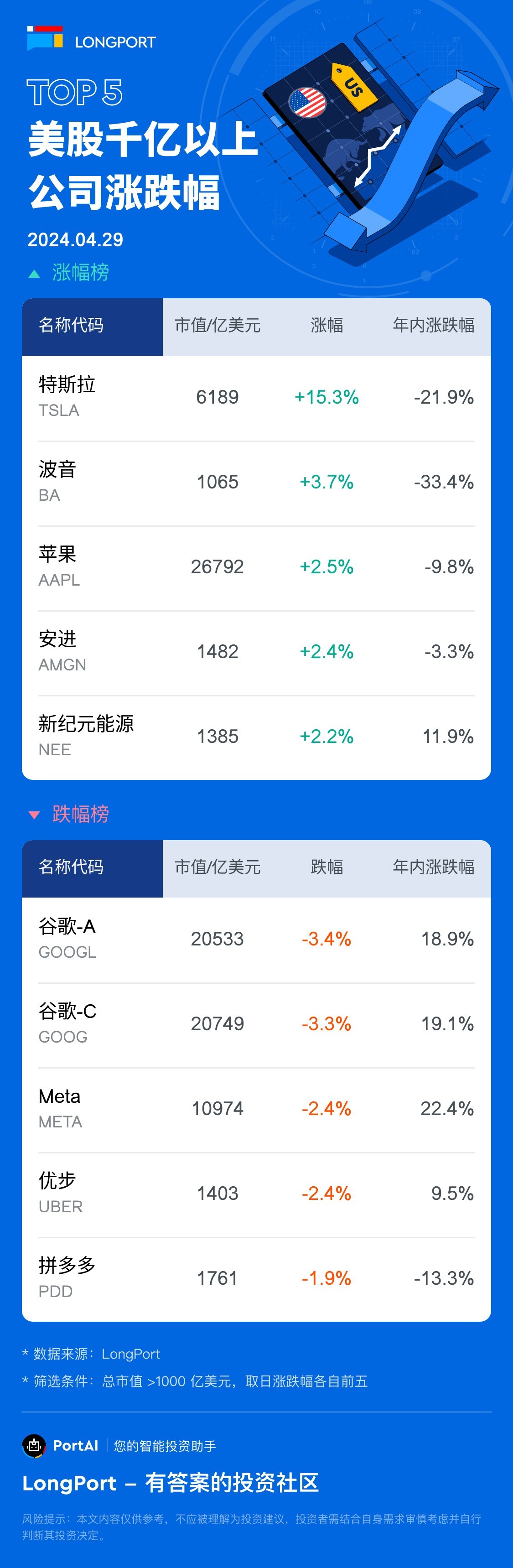 Top 5 US Stock Gainers/Losers (>100B) (4.29)