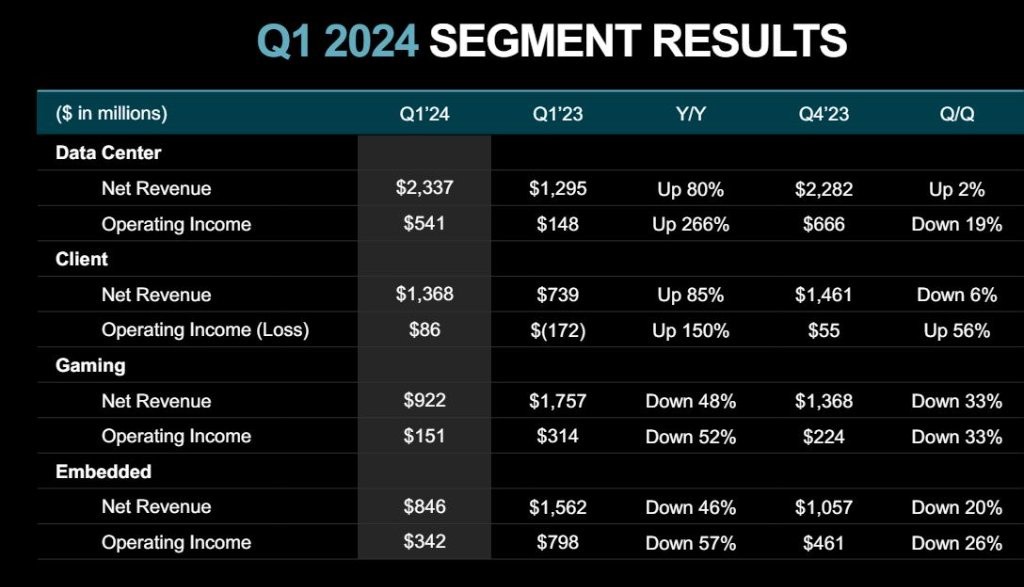 分业务来看,包含全新 AI 芯片的数据中心事业部一季度收入较上年同期的 13 亿美元大幅增长 80% 至 23 亿美元,创下该业务部门的历史最高纪录,高于市场预期的 22.7 亿美元,也明显好于去年四季度的收入同比增速 38%,代表去年底推出的人工智能 MI300 芯片功劳卓著。