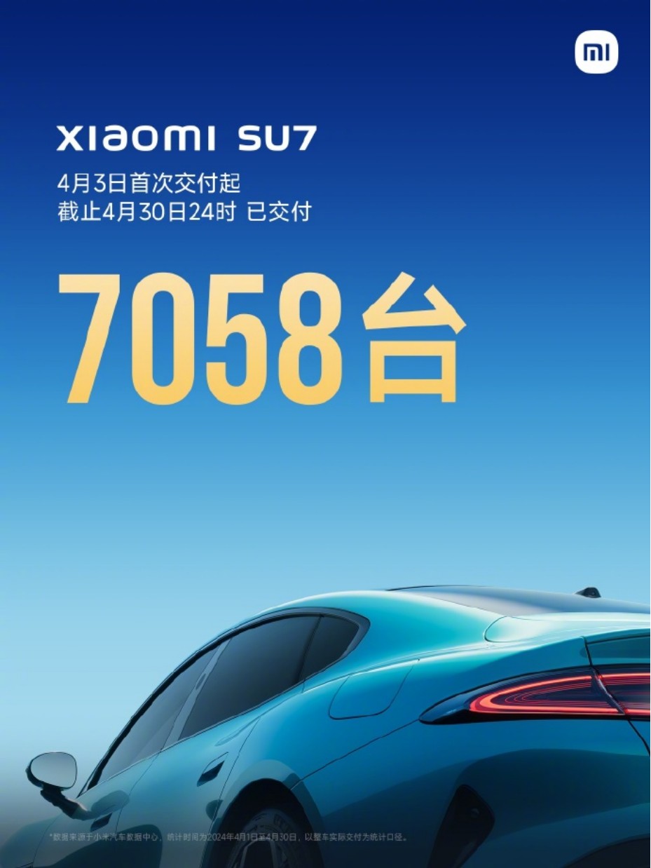 5 月 1 日,小米汽车官微宣布,截至 4 月 30 日,小米 SU74 月交付量达 7058 台。这是小米 SU7 发布后首月交付的成绩。