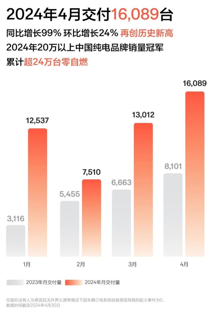 极氪汽车 4 月交付 16089 台,同比增长 99%,环比增长 24%;1-4 月累计交付 4.9 万台,同比大增 111%。据悉,2024 年极氪将挑战 23 万台的年度销量目标。