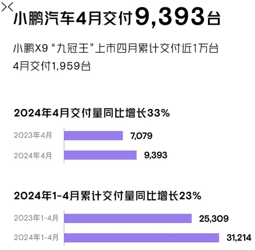 小鹏汽车 4 月共交付新车 9393 台,同比增长 33%,环比增长 4%。其中,X9 交付 1959 台,上市四月累计交付近 1 万台。2024 年 1 月-4 月,小鹏汽车累计交付新车共 31214 台,同比增长 23%。
