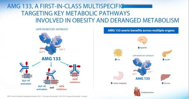 AMG133 为一款 GIPR 抗体偶联 GLP-1,可以同时发挥抑制 GIPR、激活 GLP-1R 的效应。