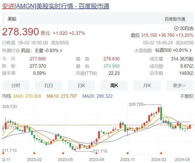 受此消息影响,安进股价盘后大涨 13%,市值增加 200 亿美元到 1700 亿美元。
