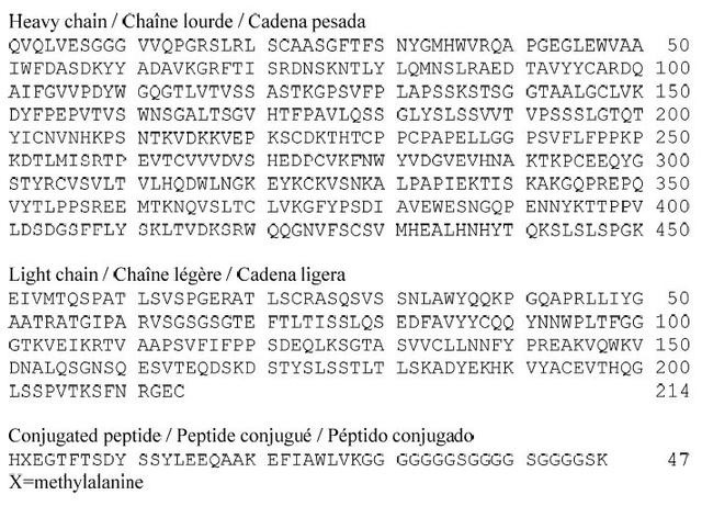 AMG 133 的氨基酸序列如下,GLP-1 类似物通过 18 肽 linker 偶联到 GIPR 抗体上,GLP-1(7-35)第 8 位为甲基丙氨酸,15 位 V 突变为 Y,22 位 G 突变为 E。
