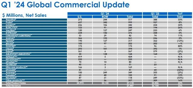 2024 年 5 月 2 日,安进发布一季度财报,营收 74.47 亿美元,同比增长 22%。收购 Horizon 带来新产品,其中 IGF-R 抗体 Tepezza 一季度销售额 4.24 亿美元。