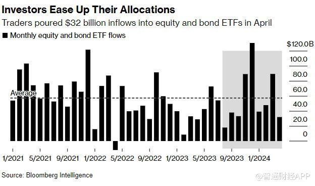根据彭博情报编制的数据,股票和债券交易所交易基金在 4 月份净流入 320 亿美元,为 2023 年 8 月以来的最小收入。交易员在 4 月从最大的投资级信贷 ETF 之一中套现了 36 亿美元,因为上升的收益率使华尔街对长期资产产生恐慌。花旗集团的 Levkovich Index 通过跟踪从期权交易到卖空和基金流动的指标来描绘市场情绪,经过数周的亢奋后,现在刚刚转为中立。