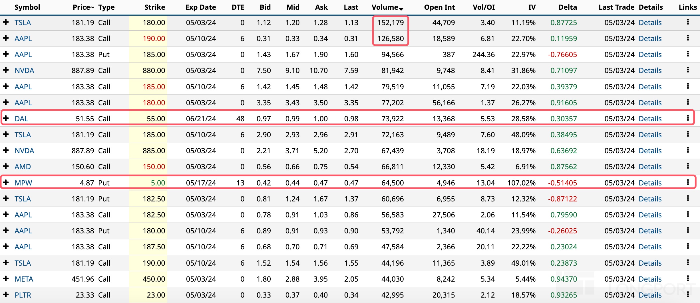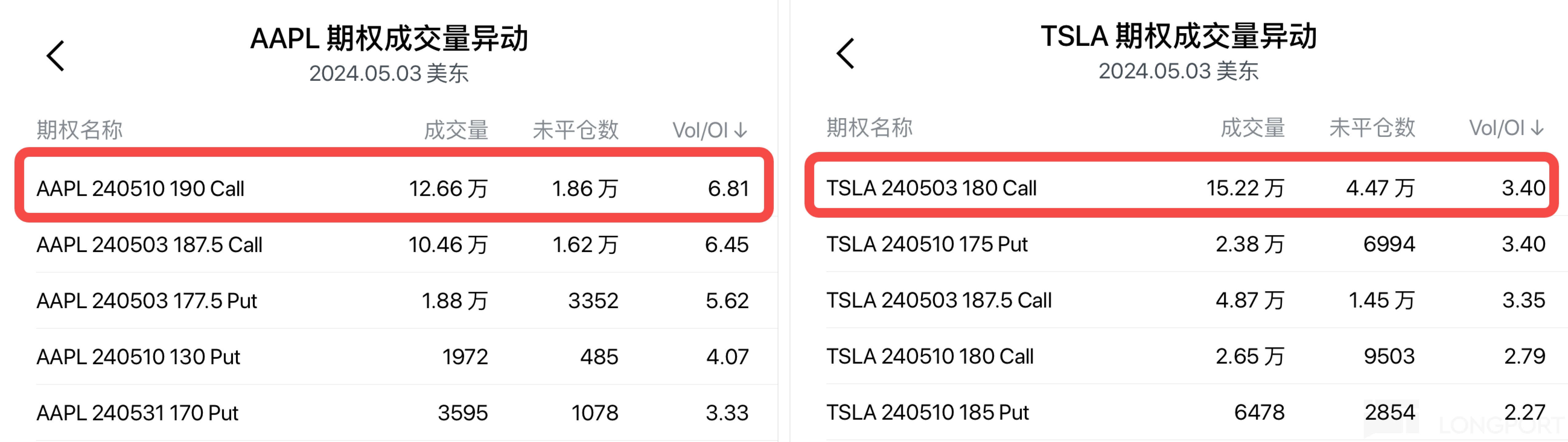 苹果大涨 6%,期权成交涨至 289 万张,看涨期权占比 65%。5 月 10 日到期、执行价 190 美元的看涨期权成交近 13 万张,5 月 3 日到期、执行价 185 美元的看涨期权成交超 9 万张。