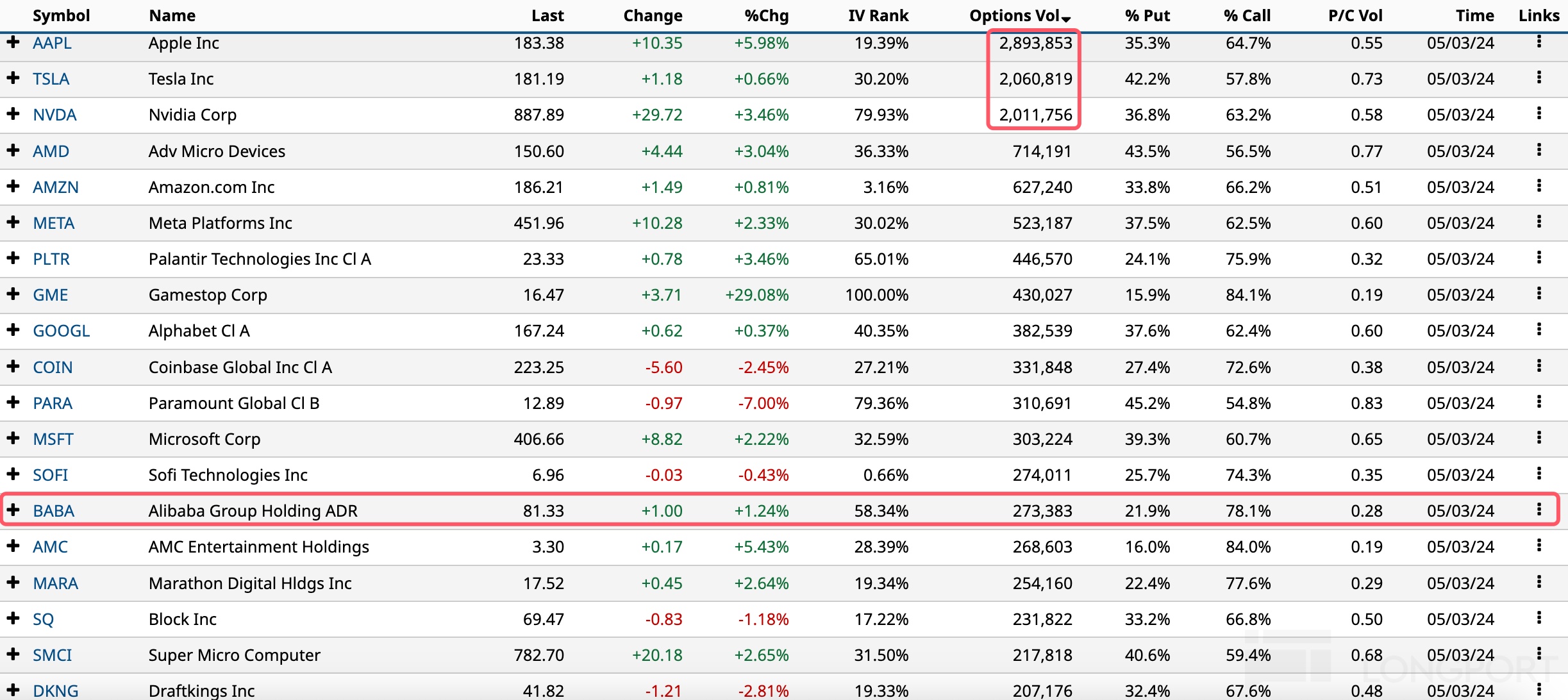 上周五最火合约:5 月 3 日到期、执行价 180 美元的特斯拉 call,成交 15 万张。5 月 10 日到期、执行价 190 美元的苹果 call 成交近 13 万张。游戏驿站 GME 期权成交暴涨至 43 万张,看涨期权占比 84%。阿里期权成交 27 万张,看涨期权占比 78%。