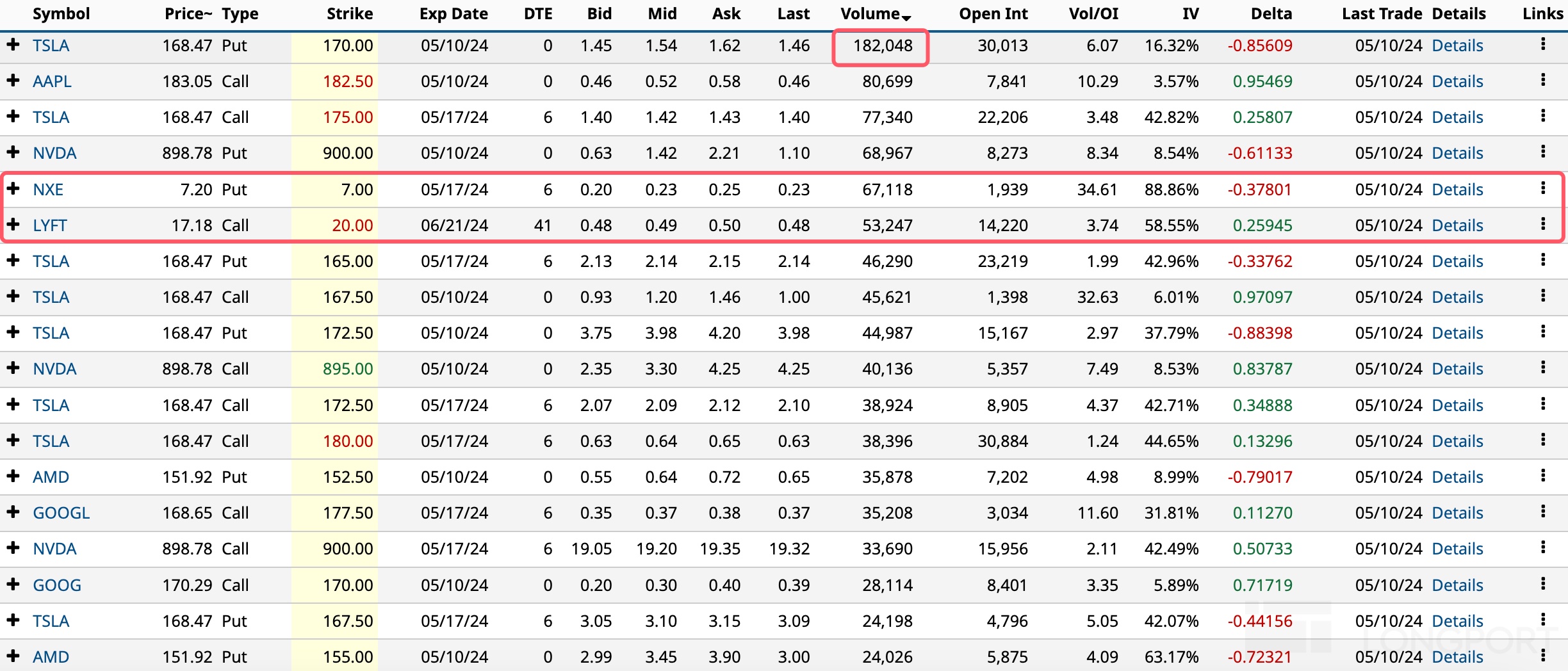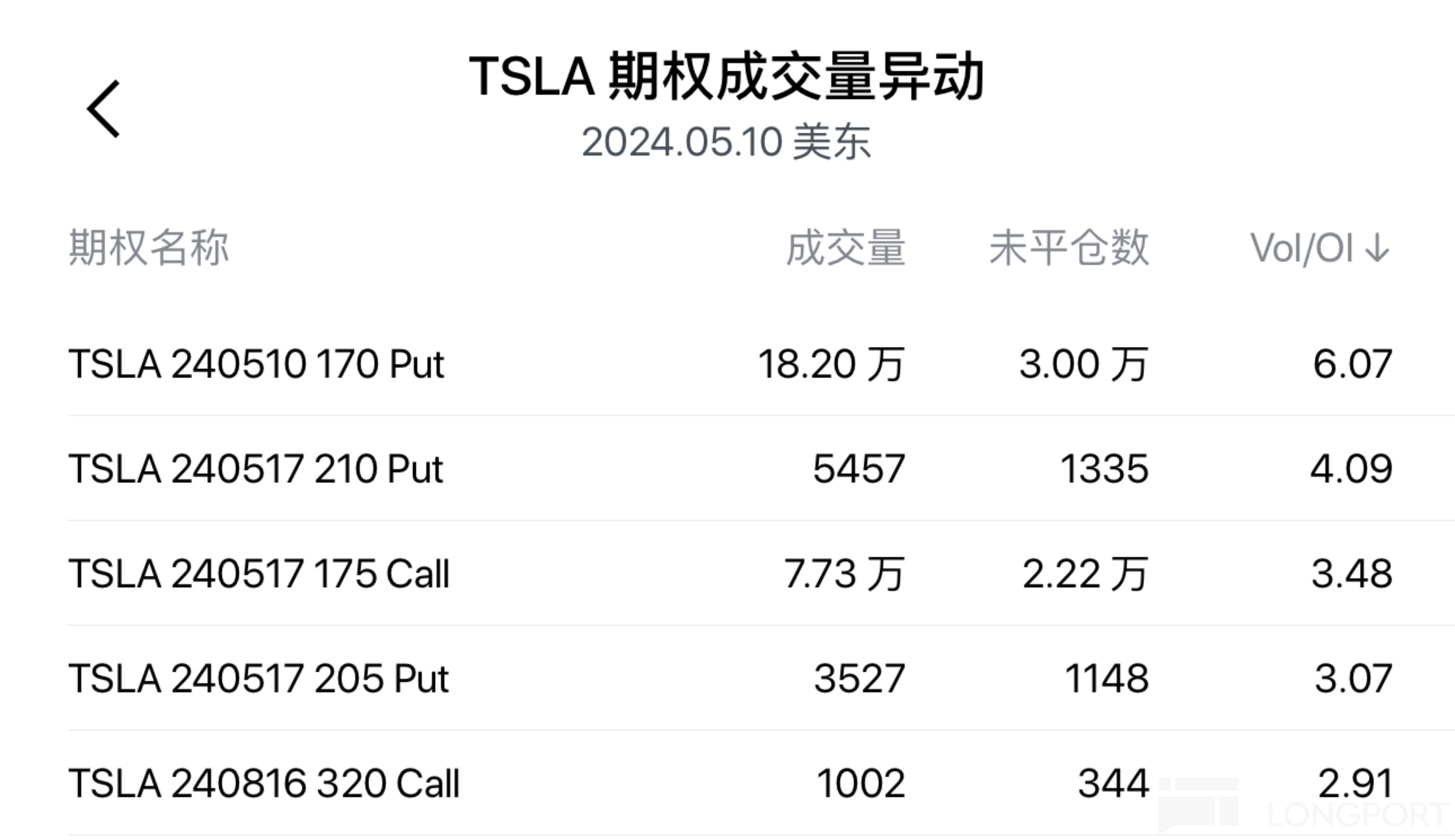 特斯拉跌 2%,期权成交大涨至 200 万张,看涨期权占比 53%。当日到期、执行价 170 美元的看跌期权成交 18 万张,5 月 17 日到期、执行价 175 美元的看涨期权成交近 8 万张。
