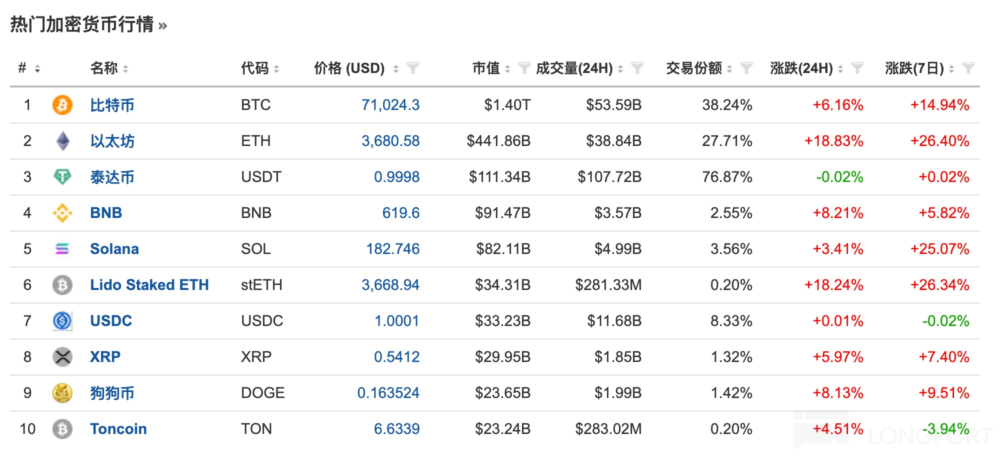 比特币现报 71024 美元,24 小时涨超 6%;以太坊现报 3680 美元,24 小时涨超 18%。