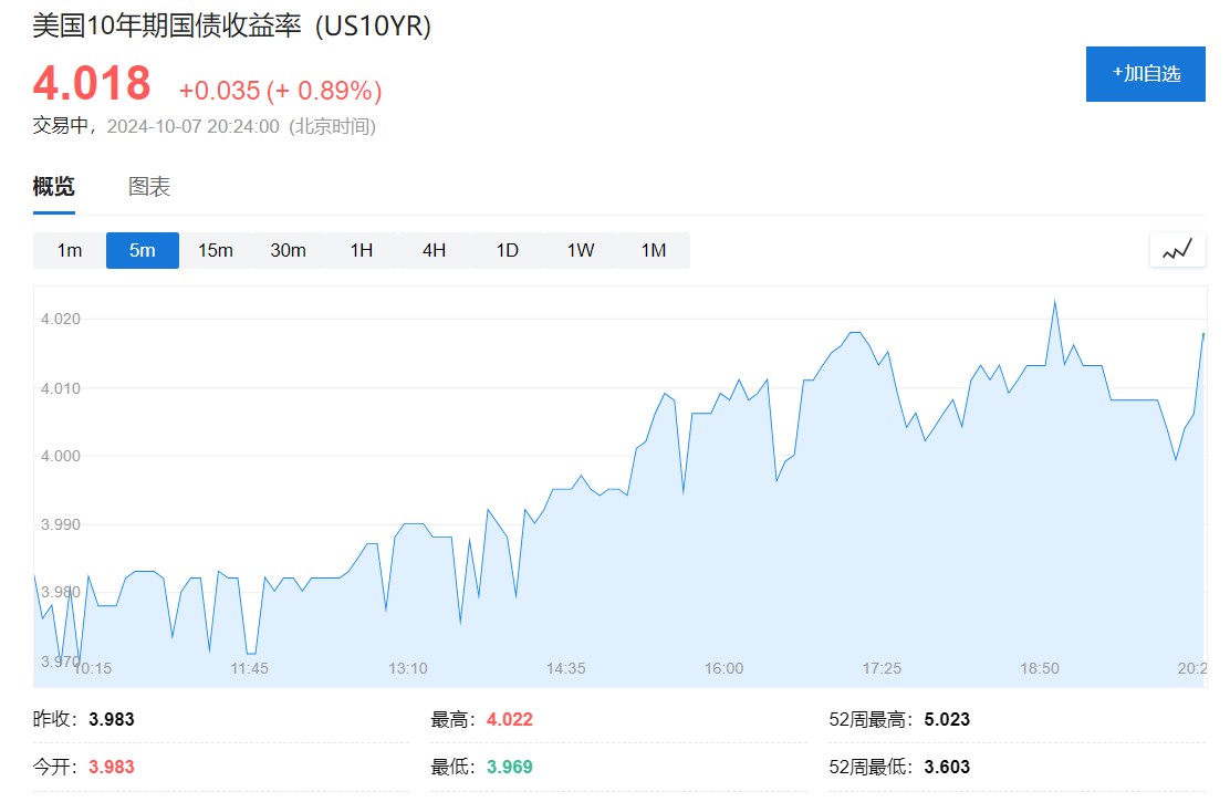 10 月 7 日周一,美股盘前,美国 10 年期国债收益率涨超 4%,美国 2 年期美国国债收益率自 8 月以来首次突破 4%,延续了周五的涨势。