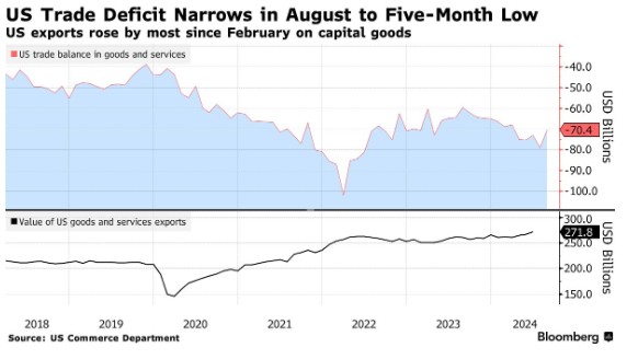 智通财经 APP 获悉,在服务贸易顺差扩大和商品出口回升的推动下,美国 8 月贸易逆差收窄至 5 个月以来最低水平。美国商务部周二公布的数据显示,商品和服务贸易逆差较上月缩小 10.8% 至 704 亿美元。8 月收窄幅度 85 亿美元是自 2023 年 3 月以来最大。这一最新数据与彭博社对经济学家的调查中值一致。