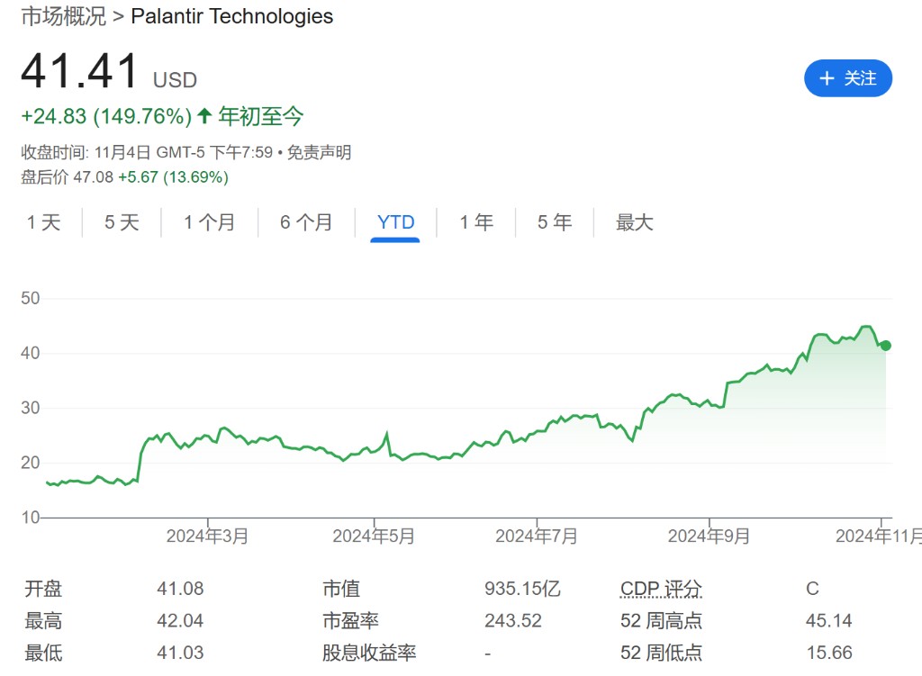 Palantir 的服务包括向政府提供可视化军队位置的软件,该公司第三季度美国政府收入增长了 40%,占总销售额 7.255 亿美元的 44% 以上。