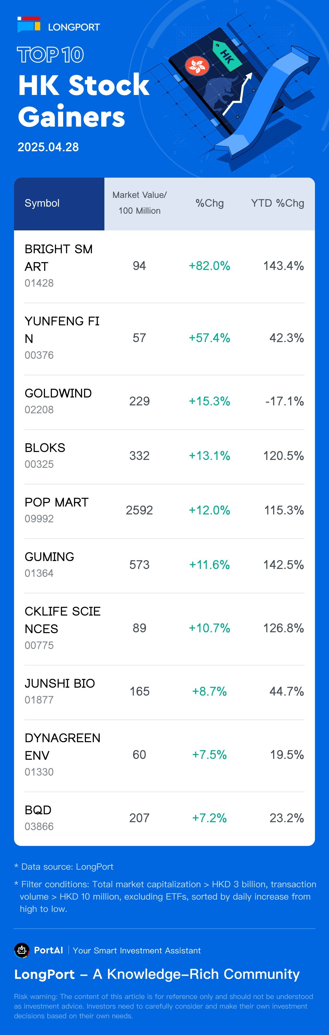 BRIGHT SMART(01428) rose 81.97%, with a trading turnover 3.5 Billion HKD, and a year-to-date rose 143.4%. YUNFENG FIN(00376) rose 57.45%, with a trading turnover 34.0 Million HKD, and a year-to-date rose 42.3%. GOLDWIND(02208) rose 15.32%, with a trading turnover 355.9 Million HKD, and a year-to-date fell 17.1%.