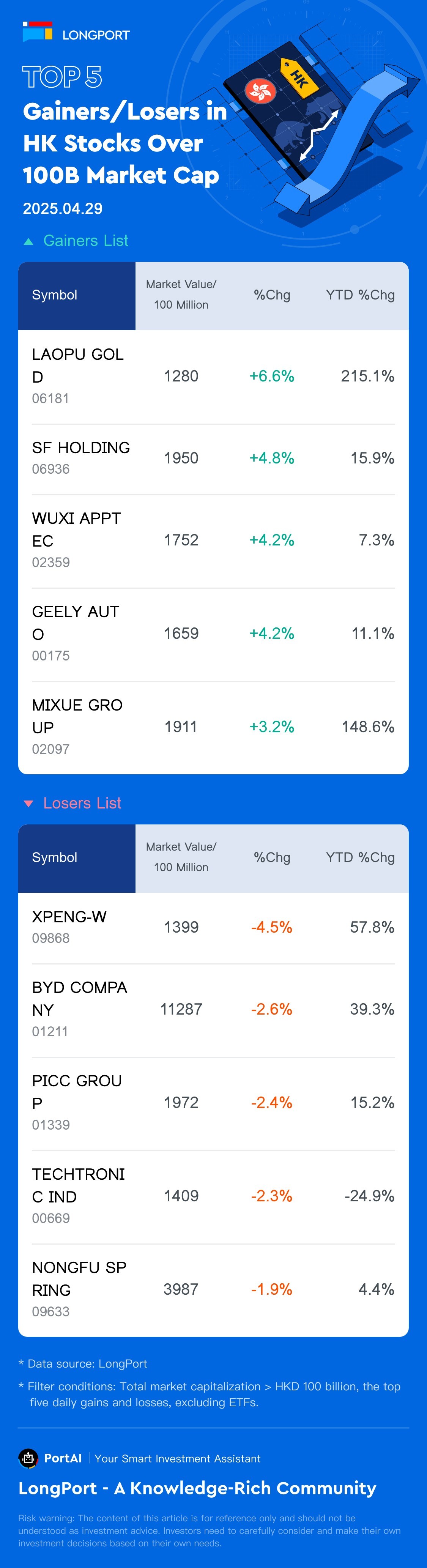 Top 5 HK Stock Gainers/Losers (>100B) (4.29)