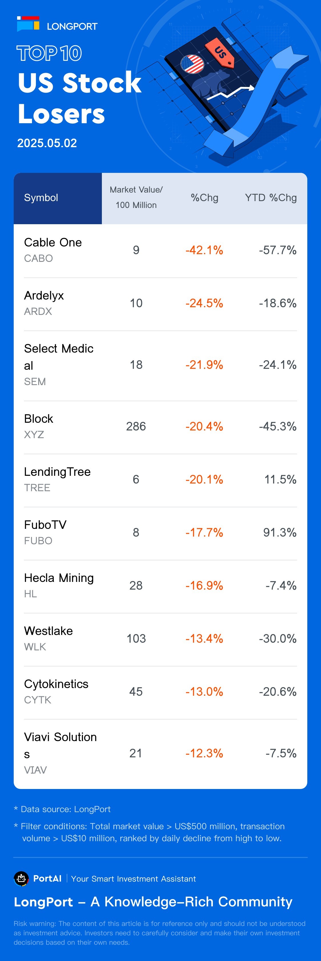 Cable One(CABO) fell 42.09%, with a trading turnover 209.7 Million USD, and a year-to-date fell 57.7%. Ardelyx(ARDX) fell 24.52%, with a trading turnover 87.6 Million USD, and a year-to-date fell 18.6%. Select Medical(SEM) fell 21.87%, with a trading turnover 62.8 Million USD, and a year-to-date fell 24.1%.