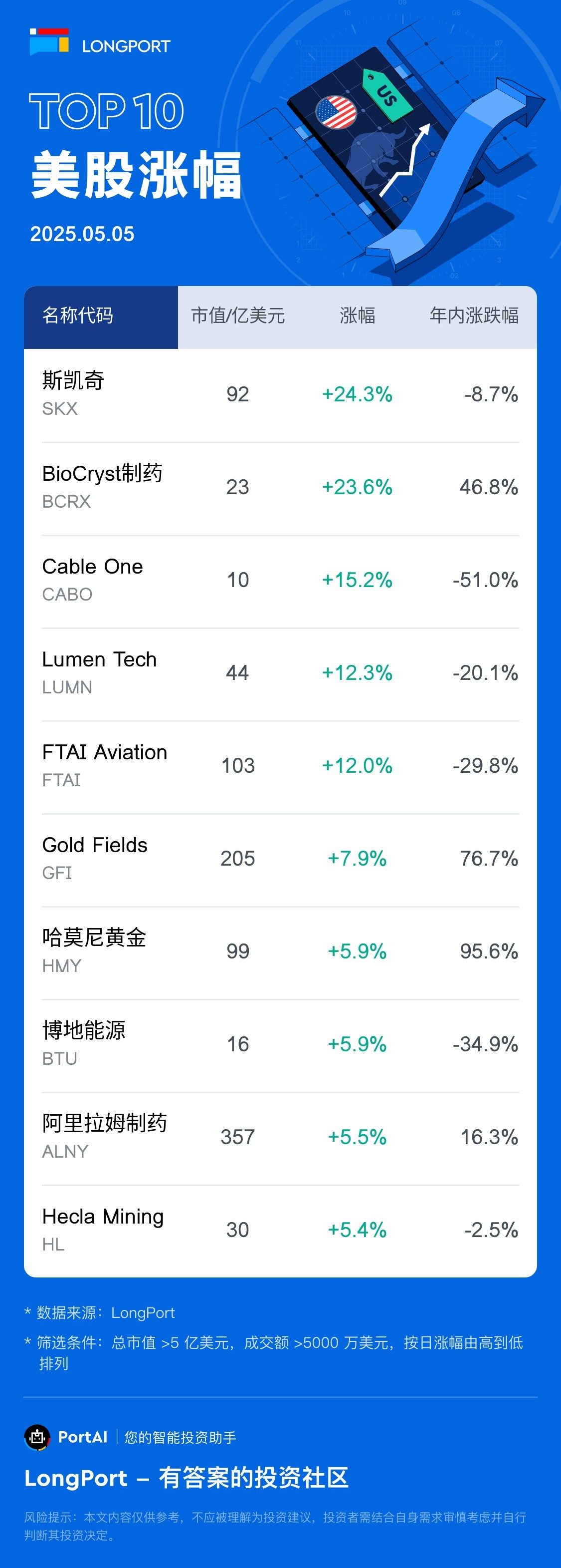 斯凯奇 (SKX) 涨 24.35%,成交额 46.7 亿美元,年内累计跌 8.7%。 BioCryst 制药 (BCRX) 涨 23.63%,成交额 2.6 亿美元,年内累计涨 46.8%。 Cable One(CABO) 涨 15.17%,成交额 1.1 亿美元,年内累计跌 51%。