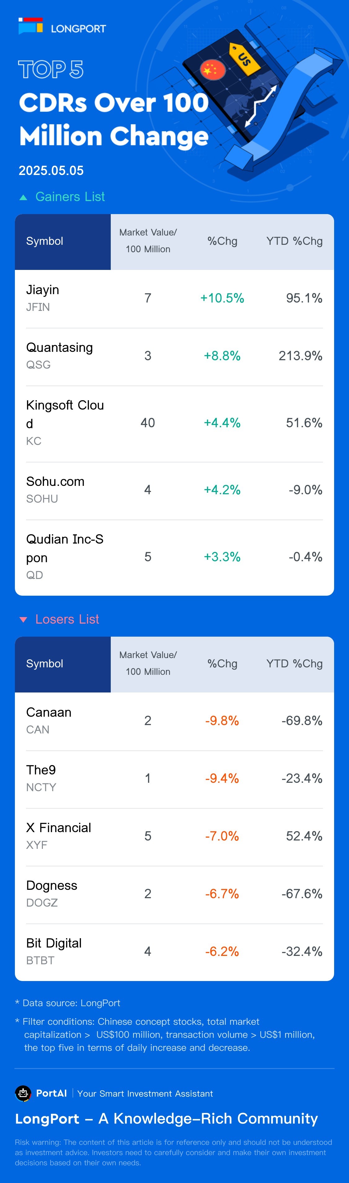 Jiayin(JFIN) rose 10.49%, with a trading turnover 2.0 Million USD, and a year-to-date rose 95.1%. Quantasing(QSG) rose 8.83%, with a trading turnover 2.7 Million USD, and a year-to-date rose 213.9%. Canaan(CAN) fell 9.83%, with a trading turnover 10.0 Million USD, and a year-to-date fell 69.8%. The9(NCTY) fell 9.43%, with a trading turnover 1.3 Million USD, and a year-to-date fell 23.4%.