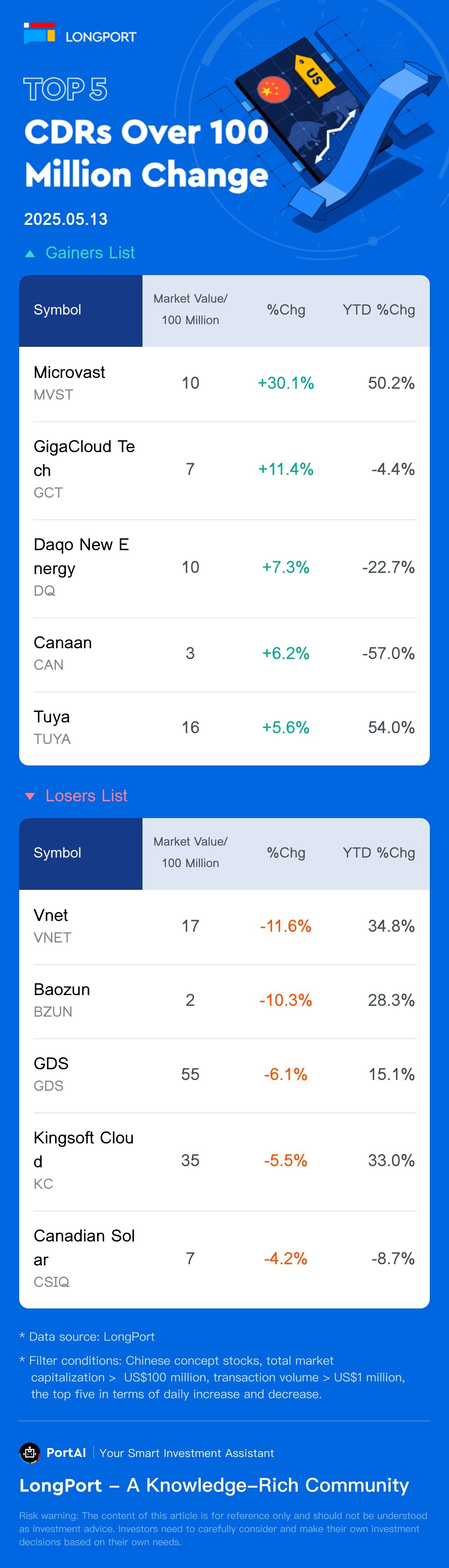 Microvast(MVST) rose 30.13%, with a trading turnover 165.9 Million USD, and a year-to-date rose 50.2%. GigaCloud Tech(GCT) rose 11.38%, with a trading turnover 43.9 Million USD, and a year-to-date fell 4.4%. Vnet(VNET) fell 11.62%, with a trading turnover 61.3 Million USD, and a year-to-date rose 34.8%. Baozun(BZUN) fell 10.28%, with a trading turnover 1.3 Million USD, and a year-to-date rose 28.3%.