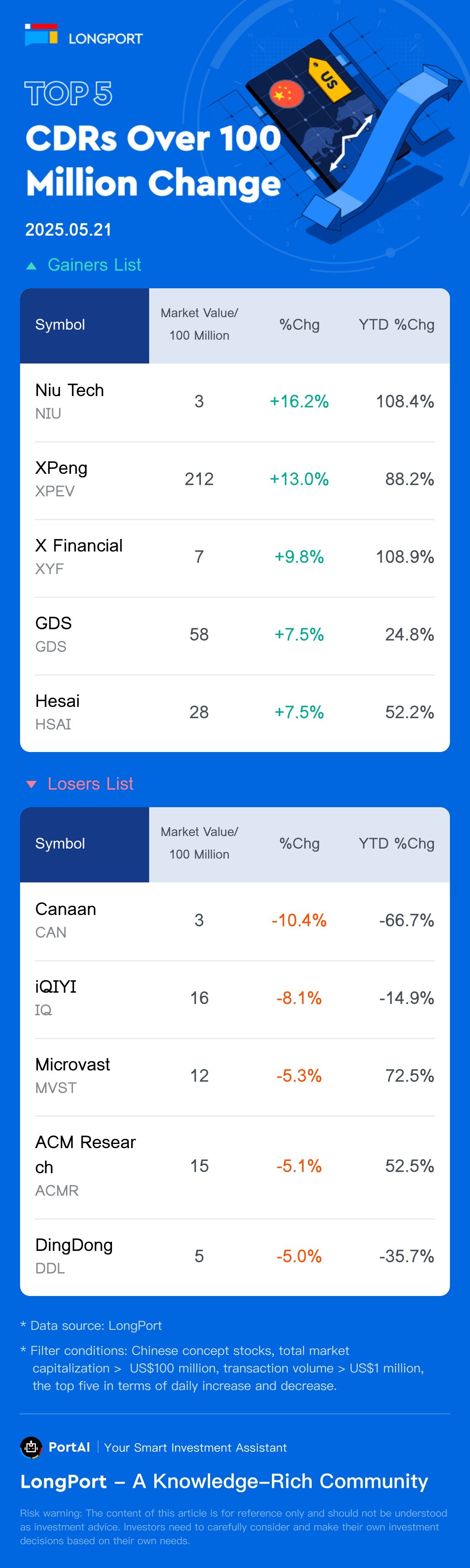 Niu Tech (NIU) rose 16.2%, with a trading turnover 14.4 Million USD, and a year-to-date rose 108.4%. XPeng(XPEV) rose 13%, with a trading turnover 632.3 Million USD, and a year-to-date rose 88.2%. Canaan(CAN) fell 10.36%, with a trading turnover 36.2 Million USD, and a year-to-date fell 66.7%. iQIYI(IQ) fell 8.06%, with a trading turnover 108.8 Million USD, and a year-to-date fell 14.9%.