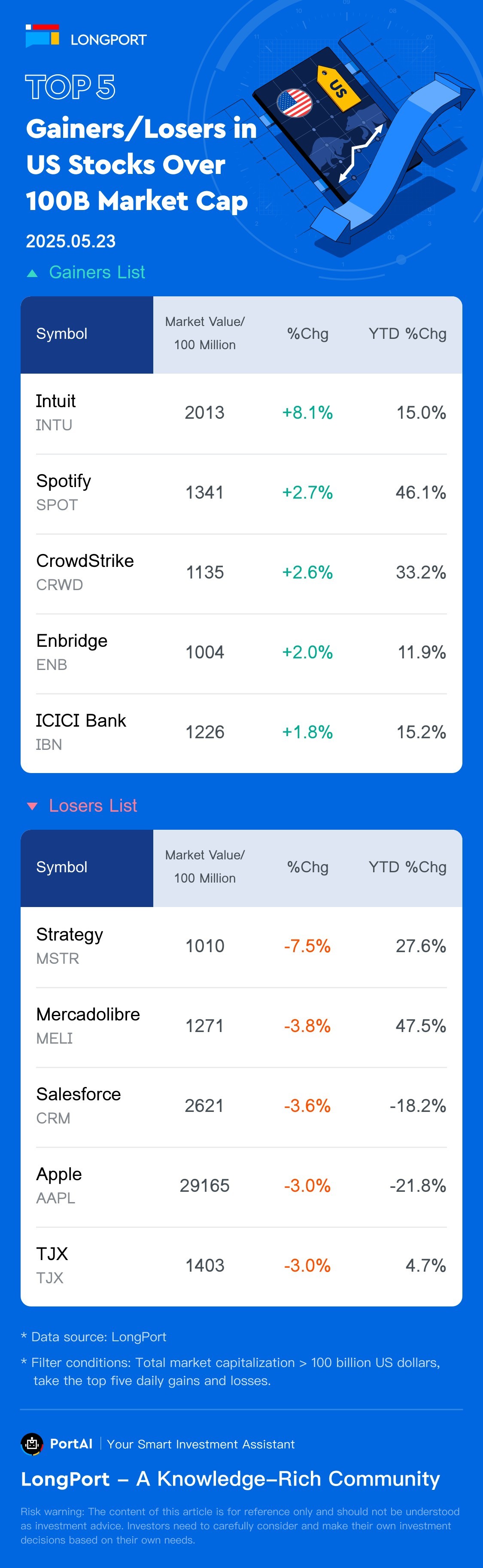 Top 5 US Stock Gainers/Losers (>100B) (5.23)