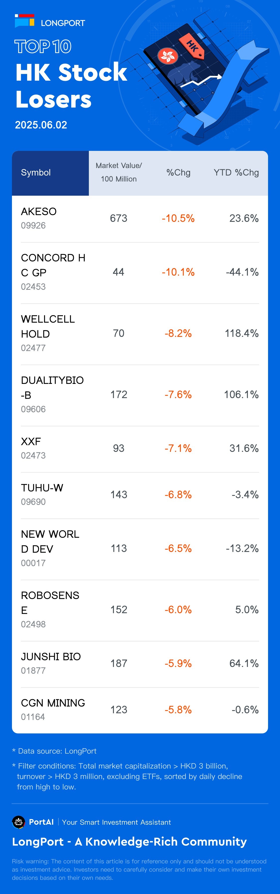AKESO(09926) fell 10.5%, with a trading turnover 1.1 Billion HKD, and a year-to-date rose 23.6%. CONCORD HC GP(02453) fell 10.09%, with a trading turnover 35.4 Million HKD, and a year-to-date fell 44.1%. WELLCELL HOLD(02477) fell 8.25%, with a trading turnover 59.9 Million HKD, and a year-to-date rose 118.4%.