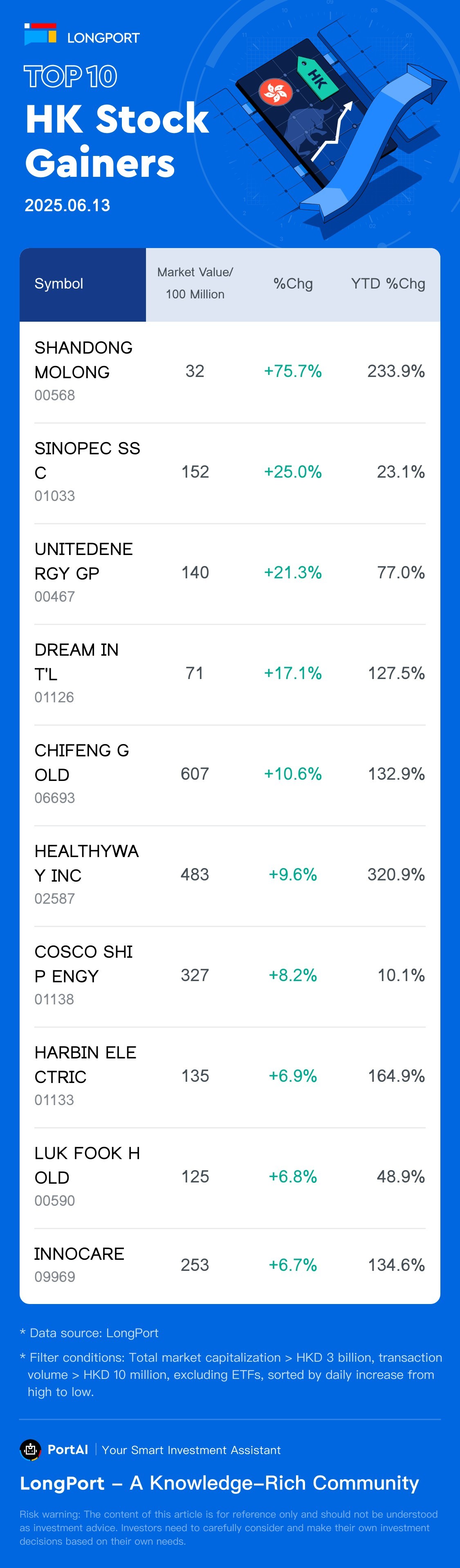 SHANDONG MOLONG(00568) rose 75.65%, with a trading turnover 7.5 Billion HKD, and a year-to-date rose 233.9%. SINOPEC SSC(01033) rose 25%, with a trading turnover 1.9 Billion HKD, and a year-to-date rose 23.1%. UNITEDENERGY GP(00467) rose 21.35%, with a trading turnover 1.1 Billion HKD, and a year-to-date rose 77%.