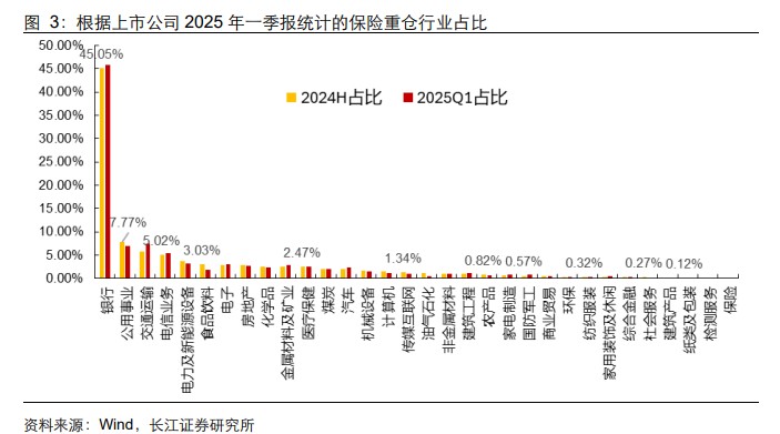 From another perspective, based on the disclosed data of the top ten shareholders in the first quarter of 2025 (excluding related party holdings), the industry distribution of heavily held stocks by insurance shows that the latest marginal changes in heavily held industries are not significant. The proportion of holdings in industries such as banking, transportation, and telecommunications has increased, while public utilities and new energy have slightly declined, and the food and beverage sector continues to show a downward trend in holding proportion.