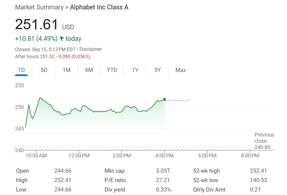 周一,谷歌母公司 Alphabet 股价一度上涨 4.8%,至 252.41 美元,市值超过 3 万亿美元重要关口。自 4 月低点以来,该公司股价已飙升逾 70%,在此期间增加了约 1.2 万亿美元的市值。自 7 月底公布季度业绩以来,公司股价已上涨逾 30%。Alphabet 收盘上涨近 4.5%,收于 251.61 美元。