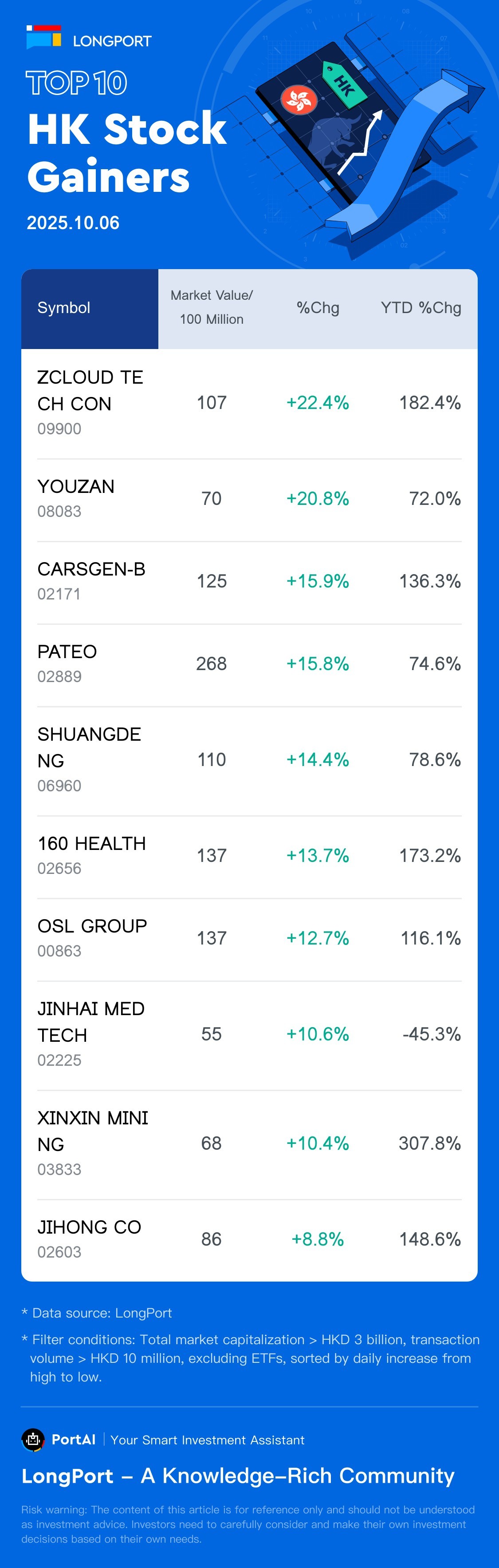ZCLOUD TECH CON(09900) rose 22.45%, with a trading turnover 27.0 Million HKD, and a year-to-date rose 182.4%. YOUZAN(08083) rose 20.79%, with a trading turnover 241.9 Million HKD, and a year-to-date rose 72%. CARSGEN-B(02171) rose 15.87%, with a trading turnover 94.9 Million HKD, and a year-to-date rose 136.3%.