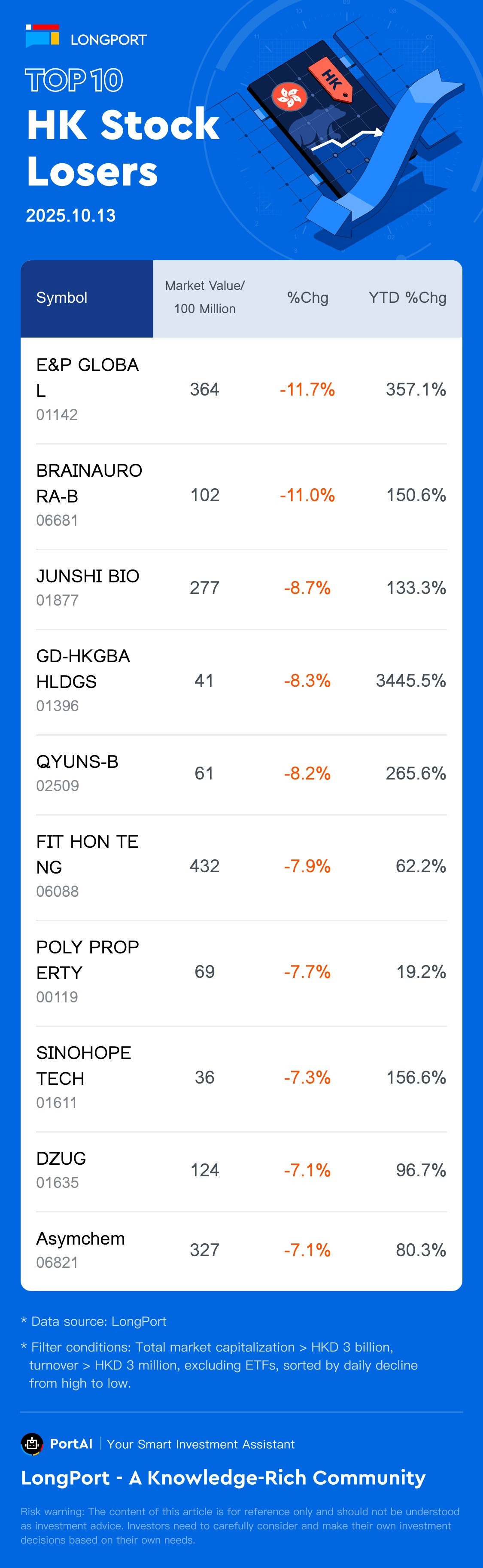 E&P GLOBAL(01142) fell 11.66%, with a trading turnover 40.7 Million HKD, and a year-to-date rose 357.1%. BRAINAURORA-B(06681) fell 11.03%, with a trading turnover 212.5 Million HKD, and a year-to-date rose 150.6%. JUNSHI BIO(01877) fell 8.65%, with a trading turnover 341.2 Million HKD, and a year-to-date rose 133.3%.