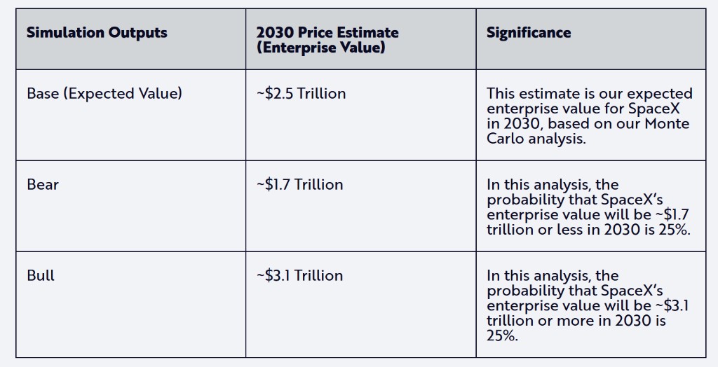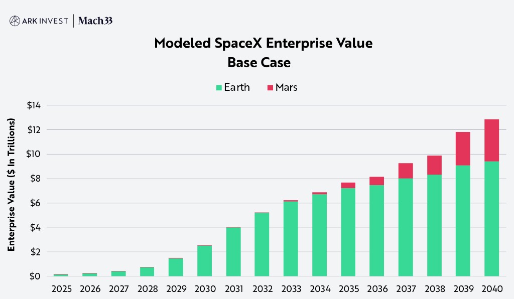 市场的狂热并非凭空而来。回溯至 2025 年 6 月 10 日,知名投资人、“马斯克长期支持者”“木头姐”(Cathie Wood)旗下的 ARK 投资管理公司就发布了一份开源估值模型报告,预测 SpaceX 的企业价值到 2030 年有望达到约 2.5 万亿美元。