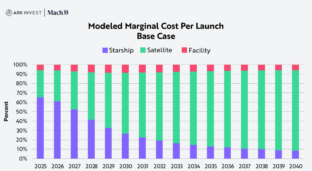 资料来源:ARK Investment Management LLC,2025 年,基于 SpaceX 截至 2025 年 5 月 29 日的数据。本文仅提供信息,不应视为投资建议或购买、出售或持有任何特定证券的推荐。