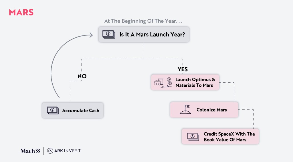 星链星座完成后,我们假设 SpaceX 将维持星座运营,然后加大火星投资。每艘前往火星的火箭都搭载 Optimus 人形机器人和材料的组合。假设 Optimus 生产力随时间提高且成本下降,SpaceX 将建立其火星"账面价值",如下所示。