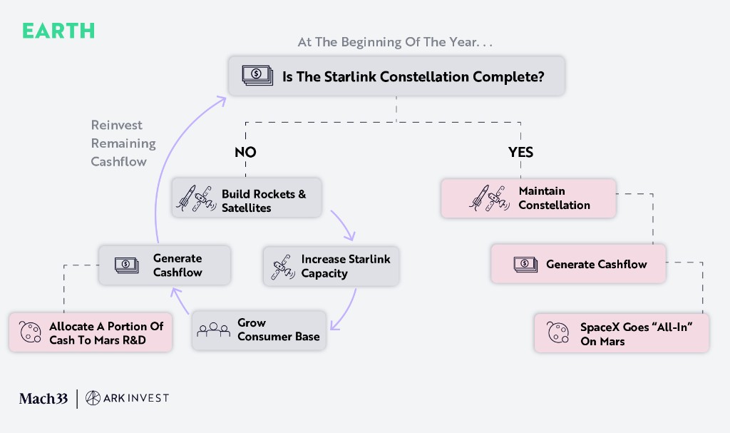 从分析角度看,该模型运作如同一个具有自我强化势头的飞轮,如下图所示:从现金开始,SpaceX 制造火箭和卫星,创造轨道带宽,获取星链用户,并再投资产生的现金。随着循环持续,资金逐步流向火星开发,直至星链星座部署完成。
