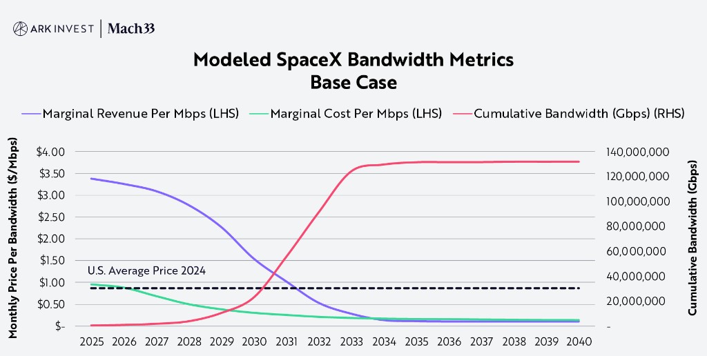 注:美国平均价格仅供参考;每月每 Mbps 边际收入(紫线)为基于我们自上而下模型的全球数值。资料来源:ARK Investment Management LLC 与 Mach33,2025 年。本分析使用了截至 2025 年 5 月 29 日的一系列外部数据源,可应要求提供。本文仅提供信息,不应视为投资建议或购买、出售或持有任何特定证券的推荐。预测本身存在固有局限性,不可作为投资决策依据,且基于反映我们自身偏见及对公司长期乐观看法的模型构建。