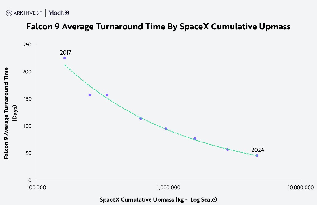 星舰是多行星生活的核心。尽管前期资本成本高,但星舰的周转时间和可重用性对其运营影响至关重要。随着星舰可重用性不断提高,更少的飞行器和更频繁的发射周期应能输送相同的上行质量。基于猎鹰 9 号数据,莱特定律表明,每次轨道上行质量累计翻倍,星舰的周转时间将以约 27% 的恒定速率下降,如下所示。