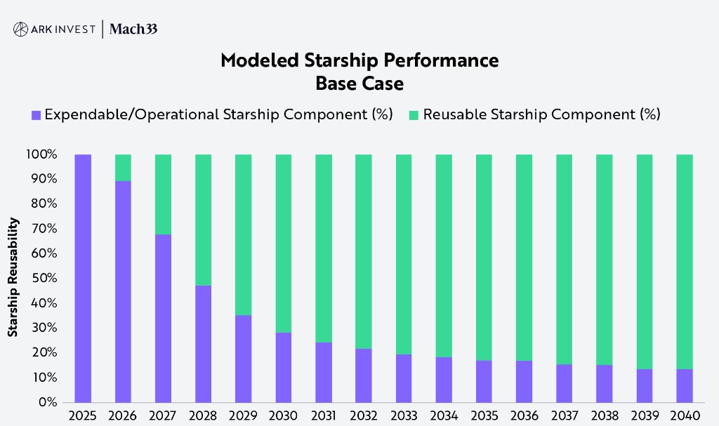 注:根据模型,即使实现快速可重用,星舰的可重用组件也永远不会达到 100%,因为每次发射总会产生可变成本,例如燃料。资料来源:ARK Investment Management LLC 与 Mach33,2025 年。本分析使用了截至 2025 年 5 月 29 日的一系列外部数据源,可应要求提供。本文仅提供信息,不应视为投资建议或购买、出售或持有任何特定证券的推荐。预测本身存在固有局限性,不可作为投资决策依据,且基于反映我们自身偏见及对公司长期乐观看法的模型构建。