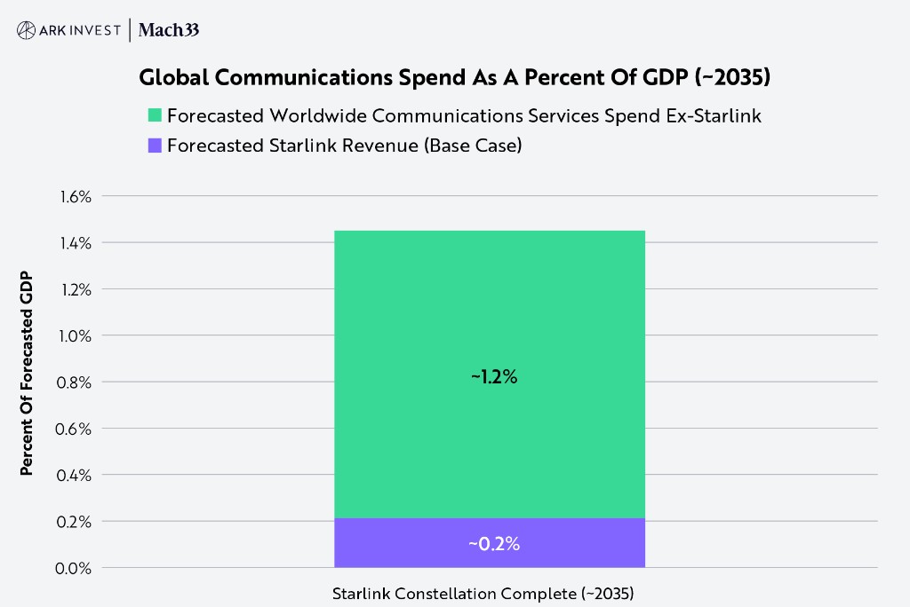 根据我们的基准情景,星链星座约在 2035 年完成后,ARK 研究显示 SpaceX 可能产生约 3000 亿美元的年收入,约占全球通信总支出的 15%,如下所示。