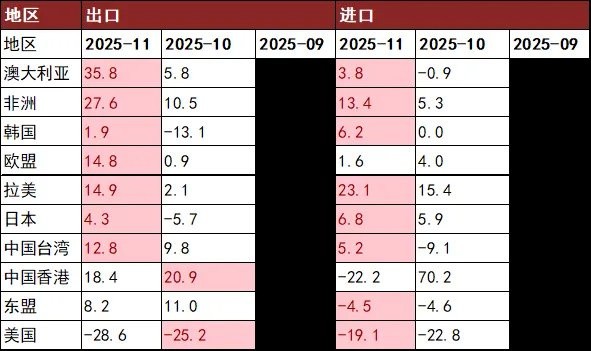 2025 年 11 月以美元计价出口同比 +5.9%(10 月为-1.1%)、进口同比 +1.9%(10 月为 +1.0%),出口高于预期、进口低于预期(Bloomberg 出口、进口市场预期分别为 +4.0%、+2.8%)。基数下降、需求平稳,推动出口同比较 10 月上升。分地区出口数据继续呈现对美国出口下降、对非美地区出口保持稳健增长的态势。分产品来看,机电产品是主要拉动项。排除基数后进口走弱。我们预计,随着基数边际上升,12 月出口同比或有所下降。