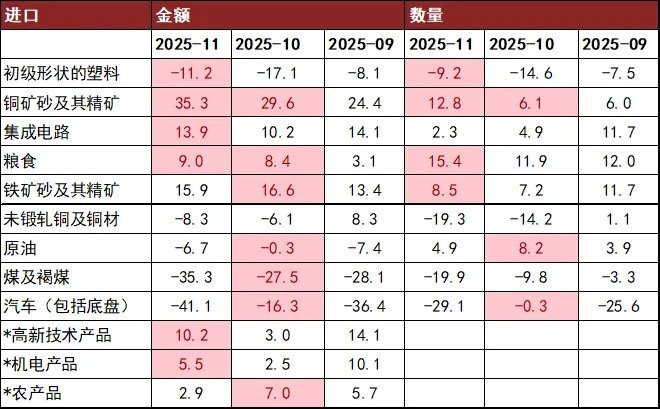 排除基数后进口走弱。进口同样受到去年同期基数影响,若排除基数影响,11 月进口两年复合同比增速为-1.1%,降幅较 10 月的-0.7% 进一步扩大。而从量价分解来看,11 月进口价格或大概率边际改善,11 月 CRB 指数同比 6.1%(10 月为 4.9%),11 月进口金额/进口货运量同比为-1.0%(10 月为-2.3%),进口数量同比增速或更弱于名义值,仍待稳内需政策进一步加力。从主要商品进口数量同比来看,11 月汽车、煤、铜材、塑料进口数量同比降幅较高。