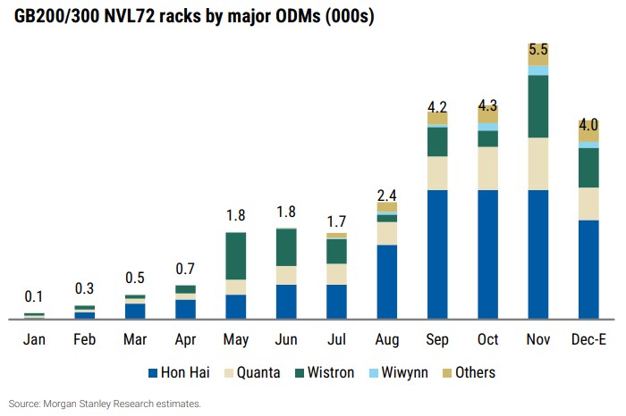Morgan Stanley expects that by November 2025, the production of GB200 racks is estimated to be around 5,500 units, a month-on-month increase of 29%.