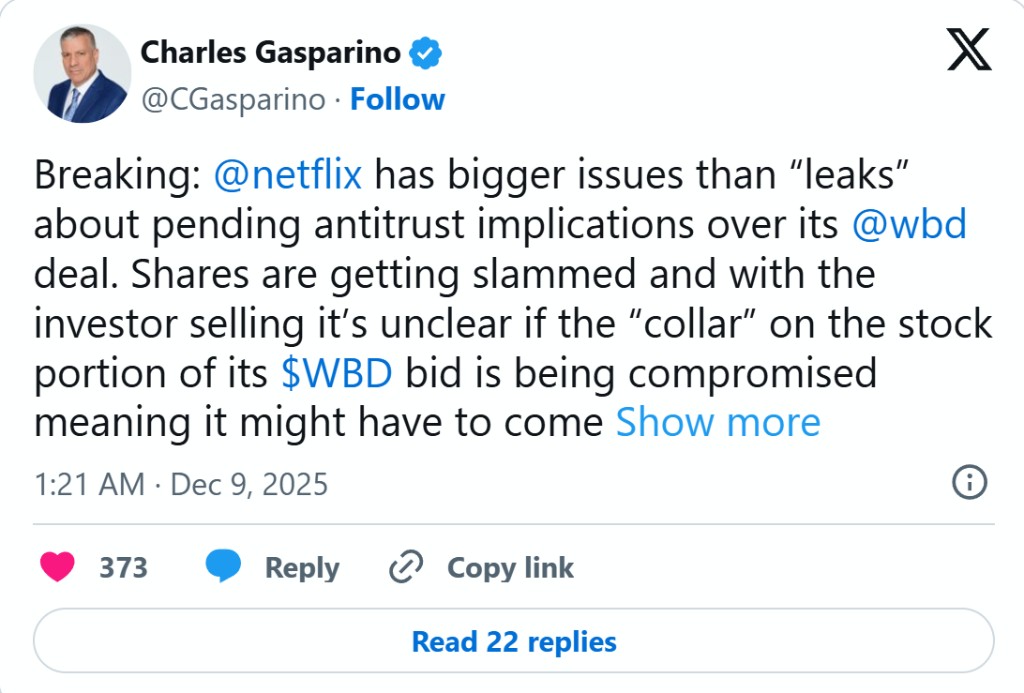According to Fox Business reporter Charles Gasparino, as Netflix's stock price plummeted, the value protection mechanism for the stock portion of its previous bid faced the risk of failure, which means Netflix may be forced to raise more cash to maintain the attractiveness of the deal.